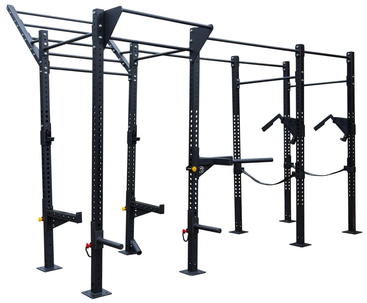 Vielseitige Trainingsstation mit 3 mm dicken Grundpfeilern aus Stahl, mit Klimmzug- und Kniebeugestation sowie Möglichkeiten für vielseitige Erweiterungen.