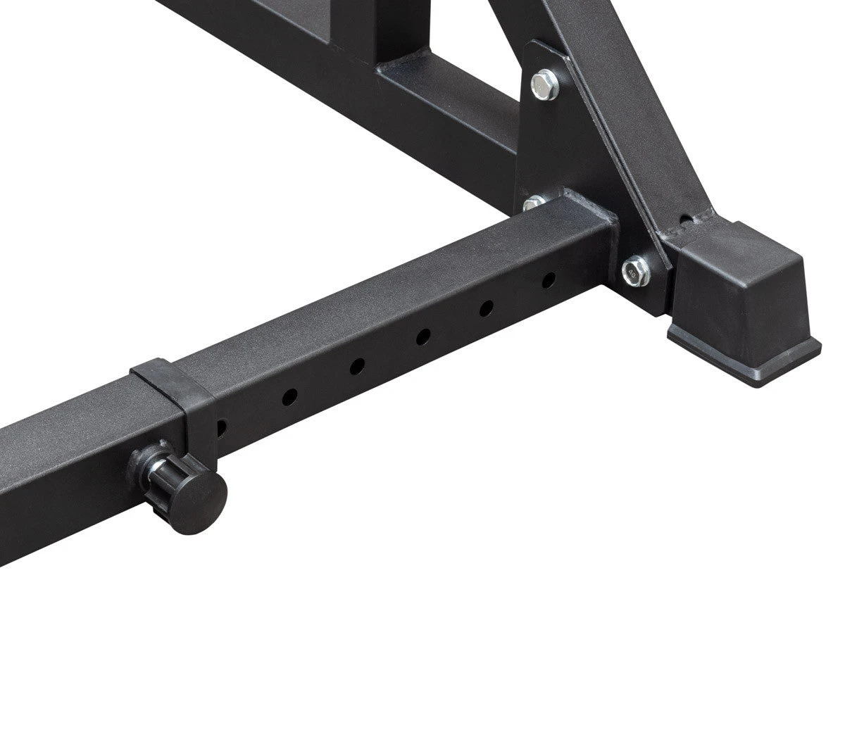 Der Kniebeugenständer ist ausgelegt für eine Belastung von 250kg. Er ist höhenverstellbar und ausgestattet mit höhenverstellbaren Sicherheitsstangen. Der Ständer hat zusätzlich Dipgriffe an den Hantelablagen. Geeignet für verschiedene Kniebeugenvarianten, Schulterdrücken, Beugestützen.