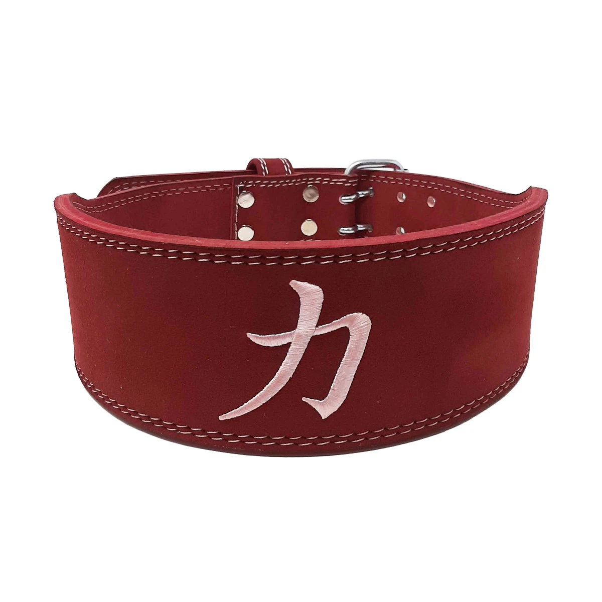 Weinroter Gewichthebergürtel mit breitem Rückenstück und Gürtelschnalle mit zwei Zinken.